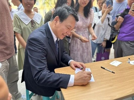 报到期间,校长陈雨露来到学院迎新现场看望新生。“来到天津还适应吗?”“孩子交给我们您就放心吧。”陈雨露校长与新生和家长亲切交谈。正值当天过生日的新生报到,校长还与在场师生一起为新生送上生日祝福。“祝福新同学,忠诚祖国,热爱南开,为中华崛起而读书。”校长在新生留言区写下对新南开金融人的勉励寄语。