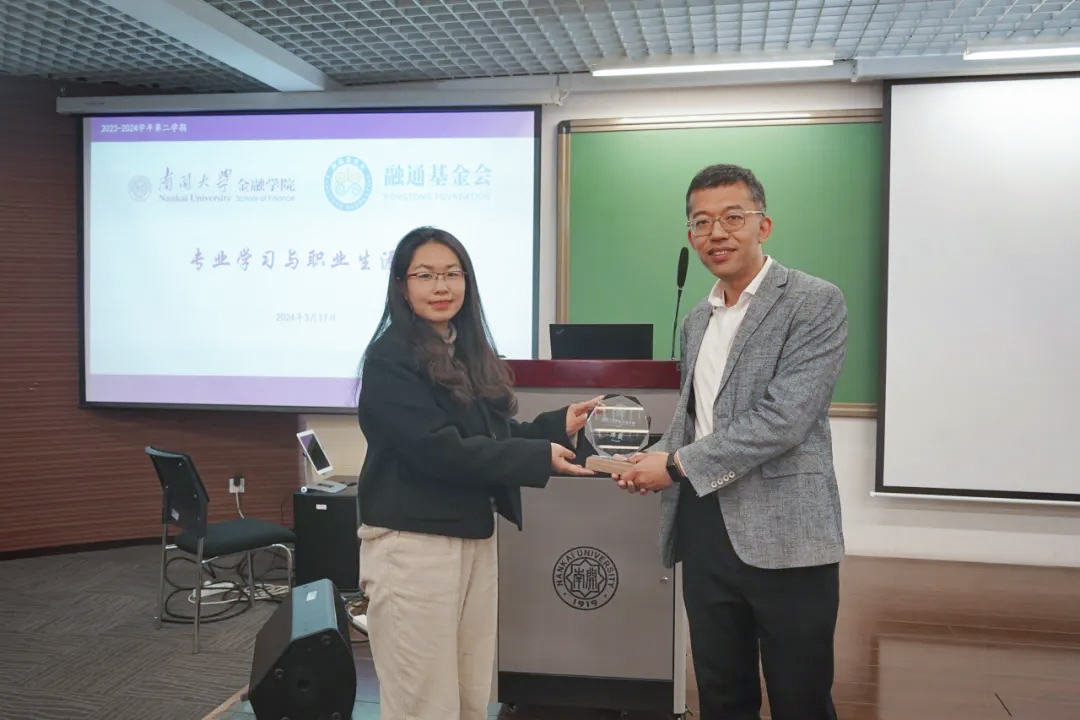高珊向毕晟校友致聘金融人才职业发展导师,对毕晟校友十年来坚持每年为学生授课表示感谢,希望同学们能向优秀校友学习,保持热爱、追求卓越。