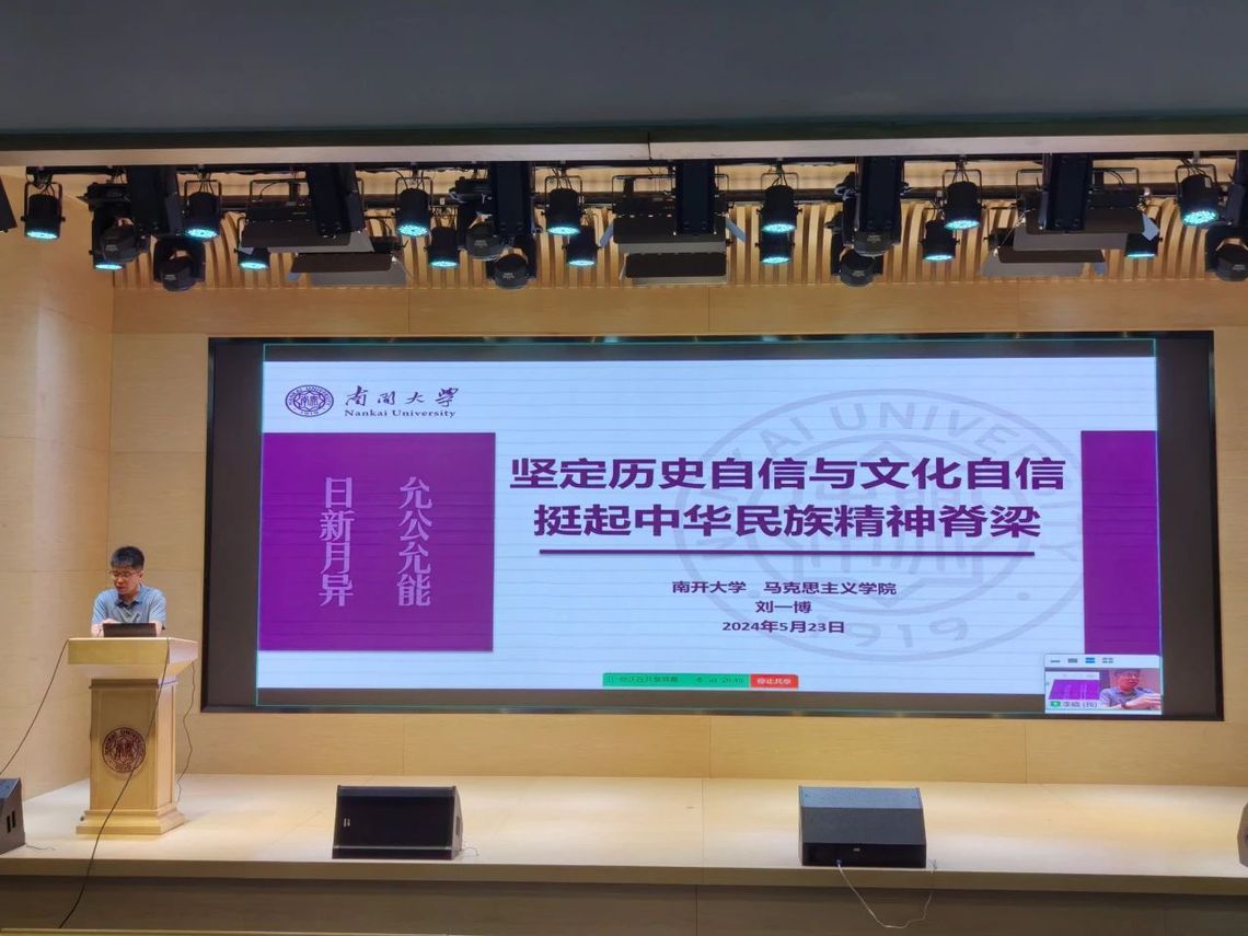 近日,本学期第三次“形势与政策”课于银河报告厅开讲,南开大学马克思主义学院副教授刘一博带来“坚定历史自信与文化自信,挺起中华民族精神脊梁”主题讲座,800余名师生线上线下一同参与本次讲座。