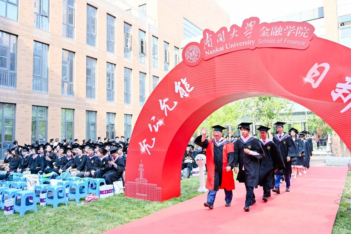 数载南开求索,一生金融征程,百年征途漫漫,砥砺青春向前。毕业生们在导师的引领下依次走上红毯、穿过毕业拱门、登上主席台接受拨穗礼。